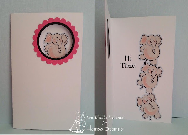 Todays "try a new technique" Splitcoaststamper challenge is hosted by the fabulous Judy of Joy in a Jar, and of course the DT co-ordinator of Hambo Stamps, ... plus the numerous other roles she has, boy oh boy is that girl busy!!, anyway today's challenge is called "external frame, internal greeting" having the frame on the outside, and the image and greeting on the inside. I have used Hambo Stamps rubber image called "ELEPHANT", masking each elephant as he climbed up. I love Mondays because the Splitcoaststamper challenges are two of my favorite, and usually if I don't like one, I have the choice of the other, but today.......I combined them both, the other challenge is a CAS challenge, choose a card that inspires you from harriet's, (aka hskelly) gallery, I chose her "certainly fun elephants" card, it is a cutie, and here is my card....